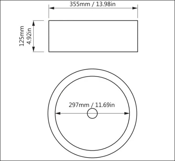 Medidas: Diámetro 297 mm, ancho 355 mm, alto 125 mm, interior acero pulido espejo alto brillo.