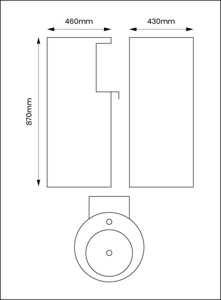 Medidas: Diámetro 430 mm, ancho 460 mm, alto 870 mm, interior acero pulido espejo alto brillo.